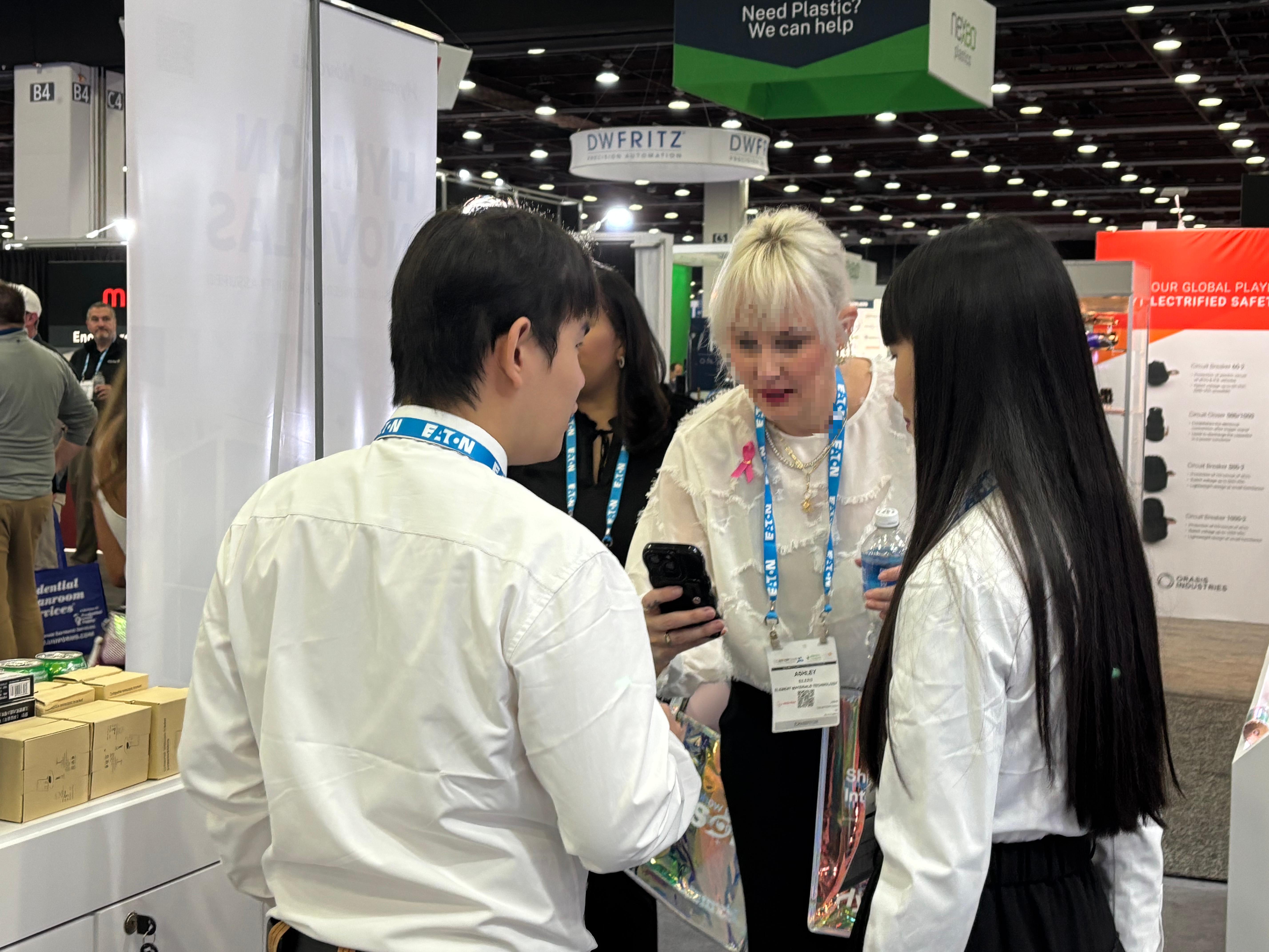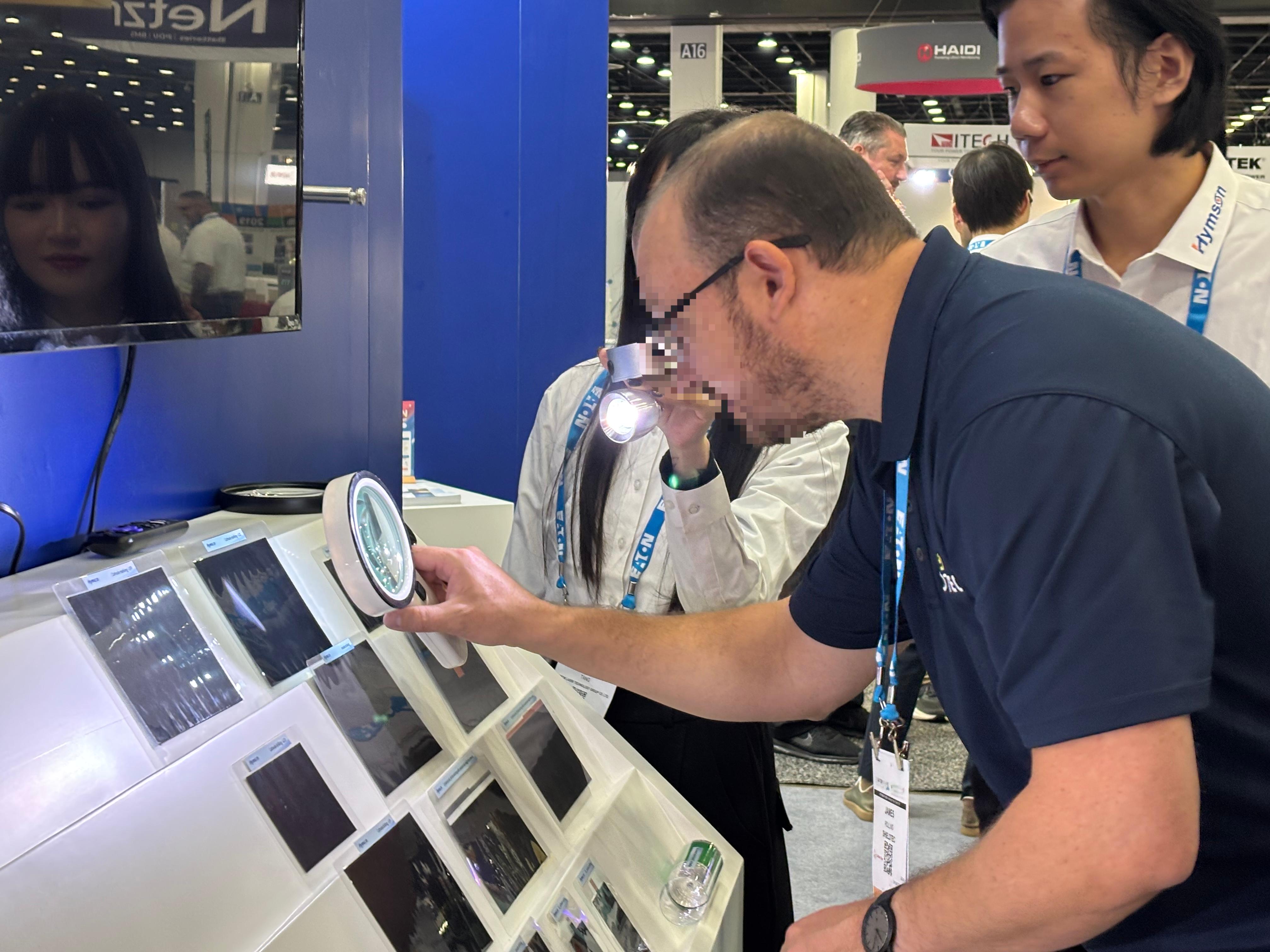 展會現(xiàn)場特設(shè)的樣品展示區(qū),海目星攜激光模切、裁切、清洗、打孔、劃線、打標等六大類制片工藝以及各類激光焊接樣品驚艷亮相,直觀呈現(xiàn)高精度、超精細的工藝水準,讓北美客戶“零距離”感受技術(shù)實力,現(xiàn)場交流咨詢絡(luò)繹不絕。